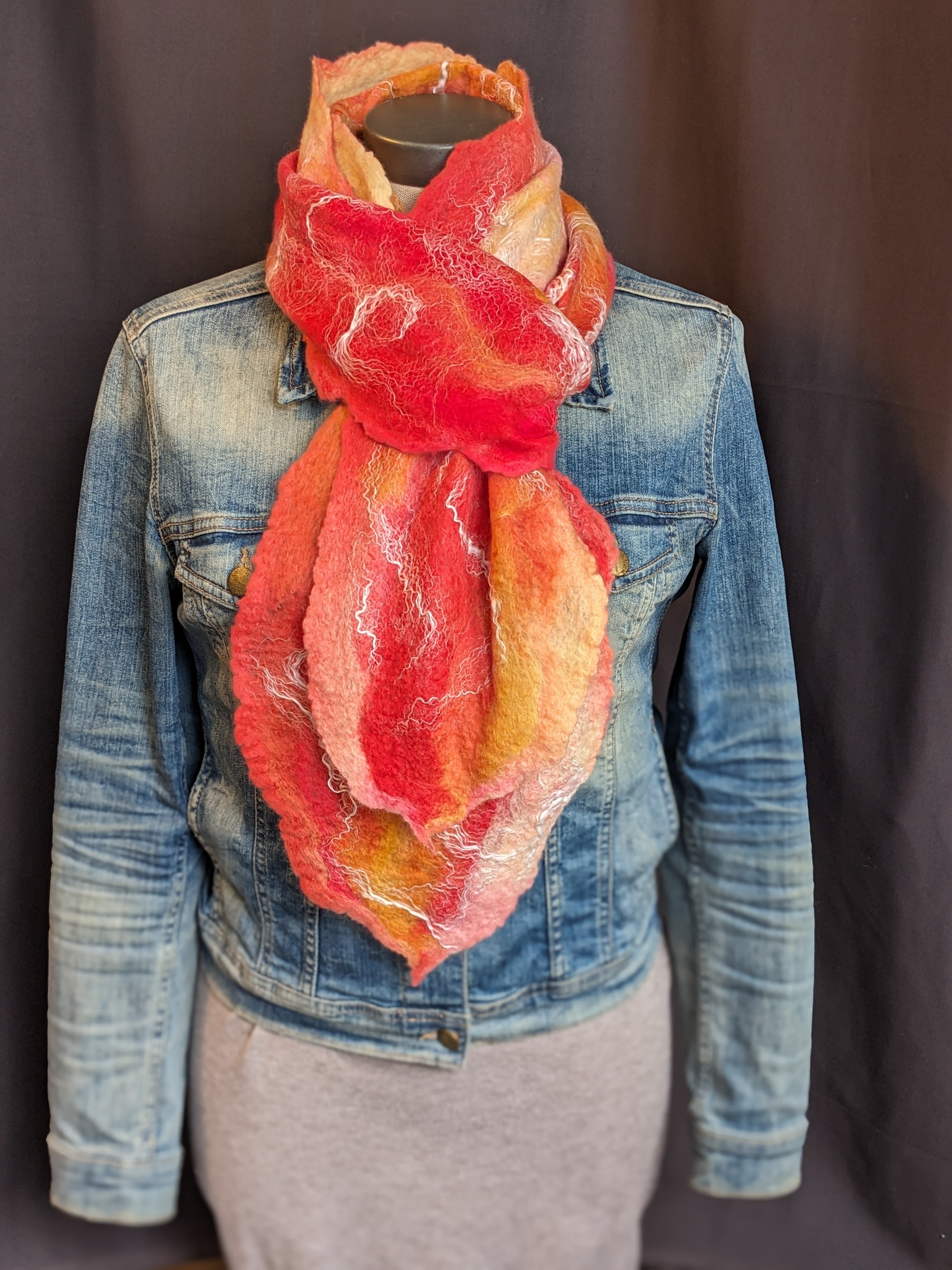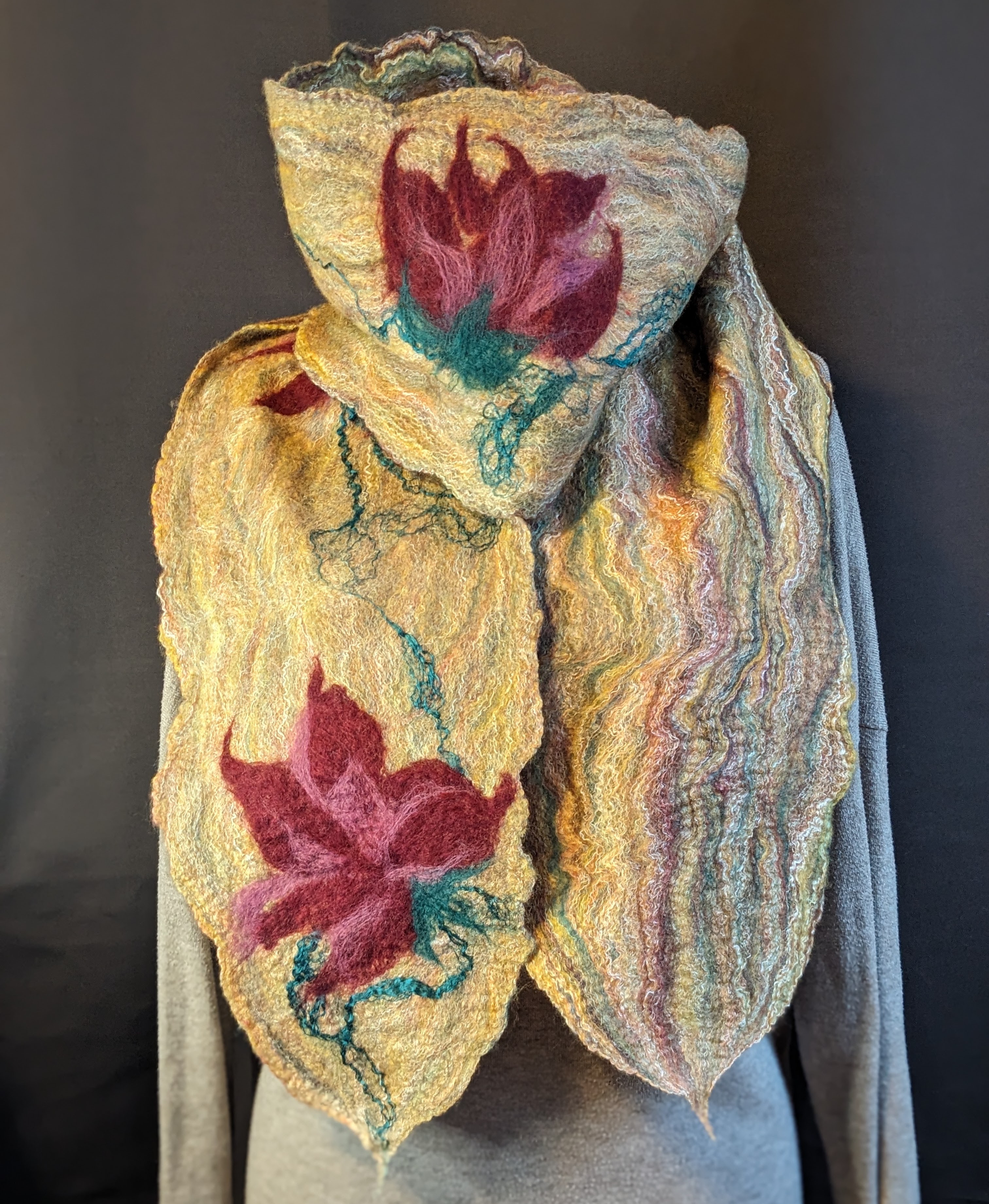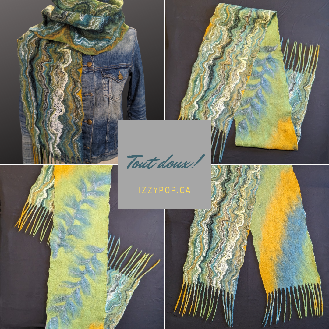 Rien de plus doux que la laine mérinos, la seule laine qui ne pique pas! Décoré de soie chatoyante, chaque foulard est absolument unique. Une touche de luxe à vos automnes, une chaleur enveloppante pour les froids plus rigoureux.